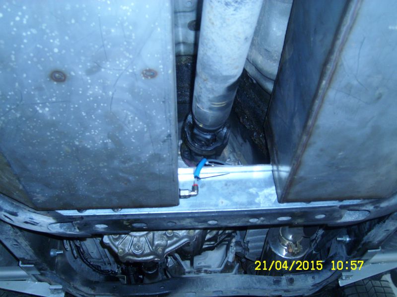 Dopo aver comprato un serbatoio in plastica da 40 litri, ho fatto un intelaiatura con un profilato a L, per posizionarlo sul fianco sinistro dell'albero di trasmissione, dalla parte opposta del silenziatore centrale.